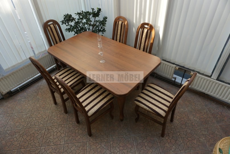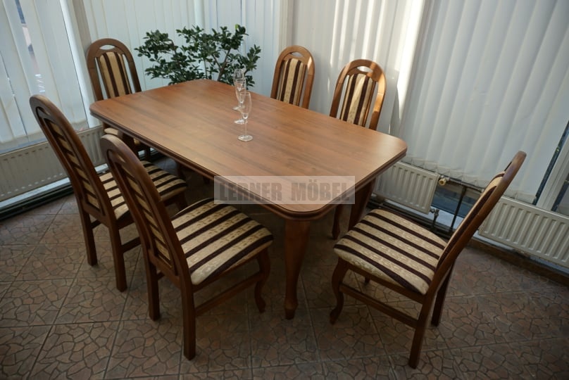 Berlin étkező garnitúraBerlin étkező garnitúra Kifinomult étkező garnitúra, 6 db kényelmes ,kárpitozott székkel és bővíthető asztallal. Masszív, kényelmes, dekoratív. Az asztallap 160 cm-ről 200 cm-re vagy akár 240 cm-re is bővíthető ! Album
